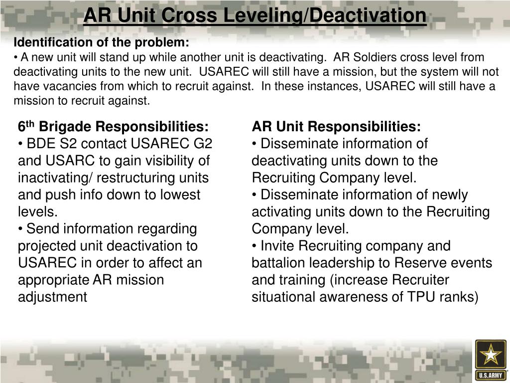 AR Unit Cross Leveling/Deactivation • Identification of the problem: • A new unit will stand up while another unit is deactivating. AR Soldiers cross level from deactivating units to the new unit. USAREC will still have a mission, but the system will not have vacancies from which to recruit against. In these instances, USAREC will still have a mission to recruit against. • 6th Brigade Responsibilities: • BDE S2 contact USAREC G2 and USARC to gain visibility of inactivating/ restructuring units and push info down to lowest levels. • Send information regarding projected unit deactivation to USAREC in order to affect an appropriate AR mission adjustment • AR Unit Responsibilities: • Disseminate information of deactivating units down to the Recruiting Company level. • Disseminate information of newly activating units down to the Recruiting Company level. • Invite Recruiting company and battalion leadership to Reserve events and training (increase Recruiter situational awareness of TPU ranks)