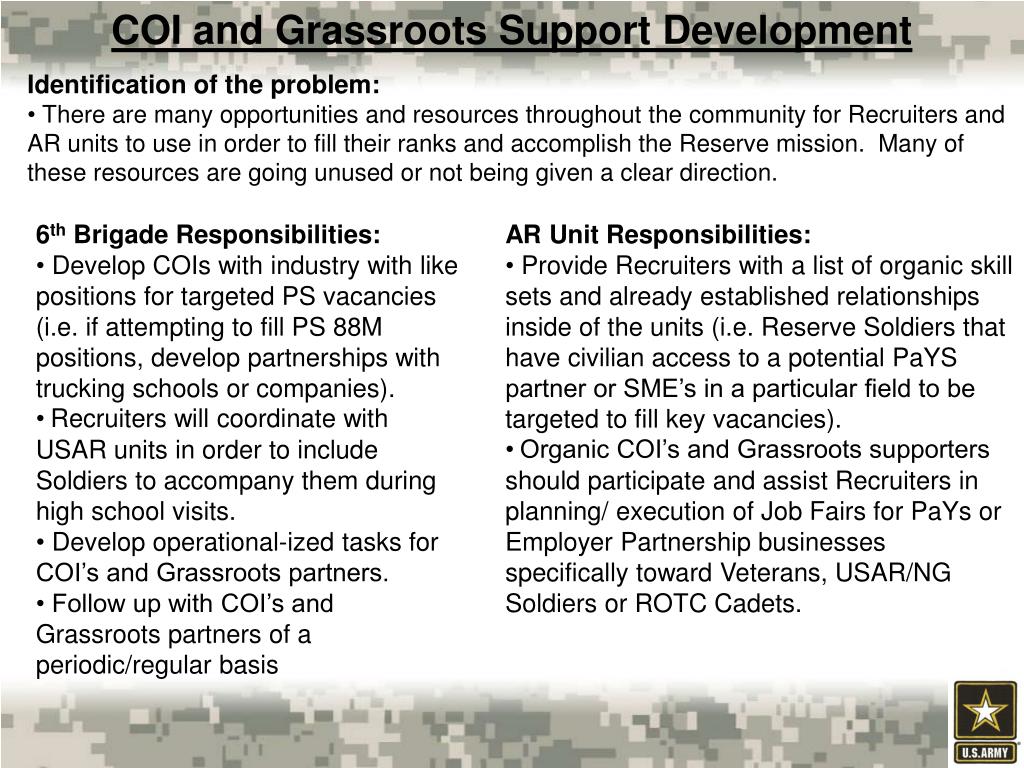 COI and Grassroots Support Development • Identification of the problem: • There are many opportunities and resources throughout the community for Recruiters and AR units to use in order to fill their ranks and accomplish the Reserve mission. Many of these resources are going unused or not being given a clear direction. • 6th Brigade Responsibilities: • Develop COIs with industry with like positions for targeted PS vacancies (i.e. if attempting to fill PS 88M positions, develop partnerships with trucking schools or companies). • Recruiters will coordinate with USAR units in order to include Soldiers to accompany them during high school visits. • Develop operational-ized tasks for COI’s and Grassroots partners. • Follow up with COI’s and Grassroots partners of a periodic/regular basis • AR Unit Responsibilities: • Provide Recruiters with a list of organic skill sets and already established relationships inside of the units (i.e. Reserve Soldiers that have civilian access to a potential PaYS partner or SME’s in a particular field to be targeted to fill key vacancies). • Organic COI’s and Grassroots supporters should participate and assist Recruiters in planning/ execution of Job Fairs for PaYs or Employer Partnership businesses specifically toward Veterans, USAR/NG Soldiers or ROTC Cadets.