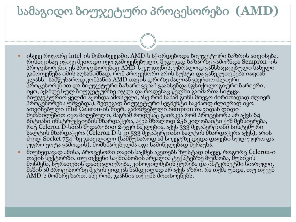 სამაგიდობიუჯეტურიპროცესორები (AMD) • ისევე როგორც intel-ის შემთხვევაში, AMD-ს სჭირდებოდა ბიუჯეტური ბაზრის ათვისება. რისთვისაც იგივე მეთოდი იყო გამოყენებული, შედეგად ბაზარზე გამოჩნდა Sempron -ის პროცესორები. ეს პროცესორებიც AMD-ს ეკუთვნის, უბრალოდ განსხავავებული სახელი გამოიყენება იმის აღსანიშნად, რომ პროცესორი არის სუსტი და განეკუთვნება იაფიან კლასს. სამწუხაროდ კომპანია AMD თავის დროზე ძალიან გაერთო ძლიერი პროცესორებით და ბიუჯეტური ბაზარი გვიან გაახსენდა (ფსიქოლოგიური ბარიერი, იყო, აქამდე სულ ბიუჯეტურზე იჯდა და როდესაც წელში გაიმართა სიტყვა ბიუჯეტურიო ყელში ჰქონდა ამოსული, ასე რომ სანამ გონს მოეგო ძირითადად ძლიერ პროცესორებს უშვებდა), შედეგად ბიუჯეტური სეგმენტი საკმაოდ ძლიერად იყო ათვისებული intel Celeron-ის მიერ. გამოშვებული Sempron თავიდან დიდი შეძახილებით იყო მიღებული, მაგრამ როდესაც გაირკვა რომ პროცესორს არ აქვს 64 ბიტიანი ინსტრუქციების მხარდაჭერა, აქვს მხოლოდ 256 კილობაიტი ქეშ მეხსიერება, რაც Celeron D-სთან შედარებით 2-ჯერ ნაკლებია, აქვს 333 მეგაჰერციანი სისტემური სალტის მხარდაჭერა (Celeron D-ს კი 533 მეგაჰერციანი სალტის მხარდაჭერა აქვს), არის ძველ Socket 754-ზე გათვლილი (სამწუხაროდ ამ სოკეტზე დედა დაფები სულ უფრო და უფრო ცოტა გამოდის), მომხმარებელმა იგი საშინელებად შერაცხა. • მიუხედავად ამისა, პროცესორი თავის საქმეს აკეთებს ზუსტად ისევე, როგორც Celeron-ი თავის სექტორში. თუ თქვენი საქმიანობის არეალია ტექსტებზე მუშაობა, მუსიკის მოსმენა, სურათების დათვალიერება, კინოფილმების ყურება და ინტერნეტში სიარული, მაშინ ამ პროცესორზე მეტის ყიდვას ნამდვილად არ აქვს აზრი. რა თქმა უნდა, თუ თქვენ AMD-ს მომხრე ხართ. ასე რომ, გააჩნია თქვენს მოთხოვნებს.