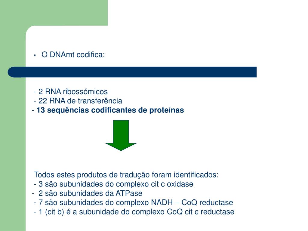 O DNAmt codifica: - 2 RNA ribossómicos - 22 RNA de transferência - 13 sequências codificantes de proteínas Todos estes produtos de tradução foram identificados: - 3 são subunidades do complexo cit c oxidase - 2 são subunidades da ATPase - 7 são subunidades do complexo NADH – CoQ reductase - 1 (cit b) é a subunidade do complexo CoQ cit c reductase
