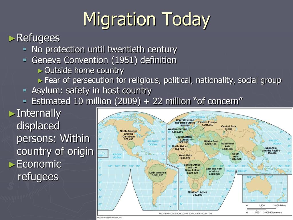 Migration Today • Refugees • No protection until twentieth century • Geneva Convention (1951) definition • Outside home country • Fear of persecution for religious, political, nationality, social group • Asylum: safety in host country • Estimated 10 million (2009) + 22 million “of concern” • Internally displaced persons: Within country of origin • Economic refugees