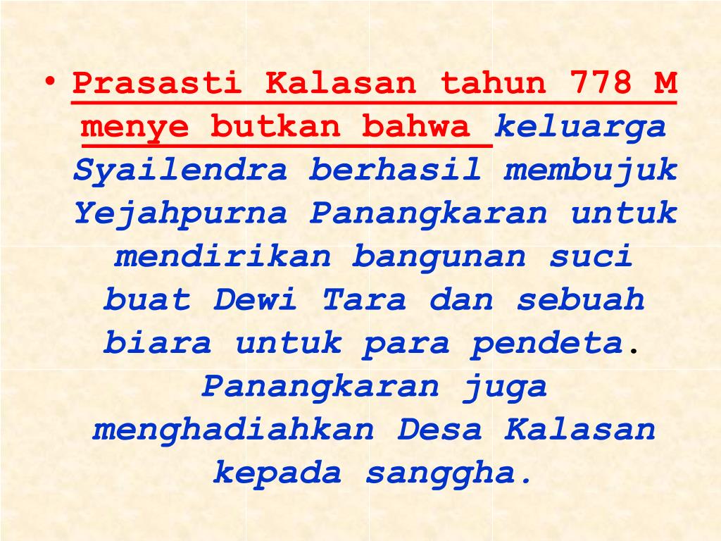 Prasasti Kalasan tahun 778 M menye butkan bahwa keluarga Syailendra berhasil membujuk Yejahpurna Panangkaran untuk mendirikan bangunan suci buat Dewi Tara dan sebuah biara untuk para pendeta. Panangkaran juga menghadiahkan Desa Kalasan kepada sanggha.
