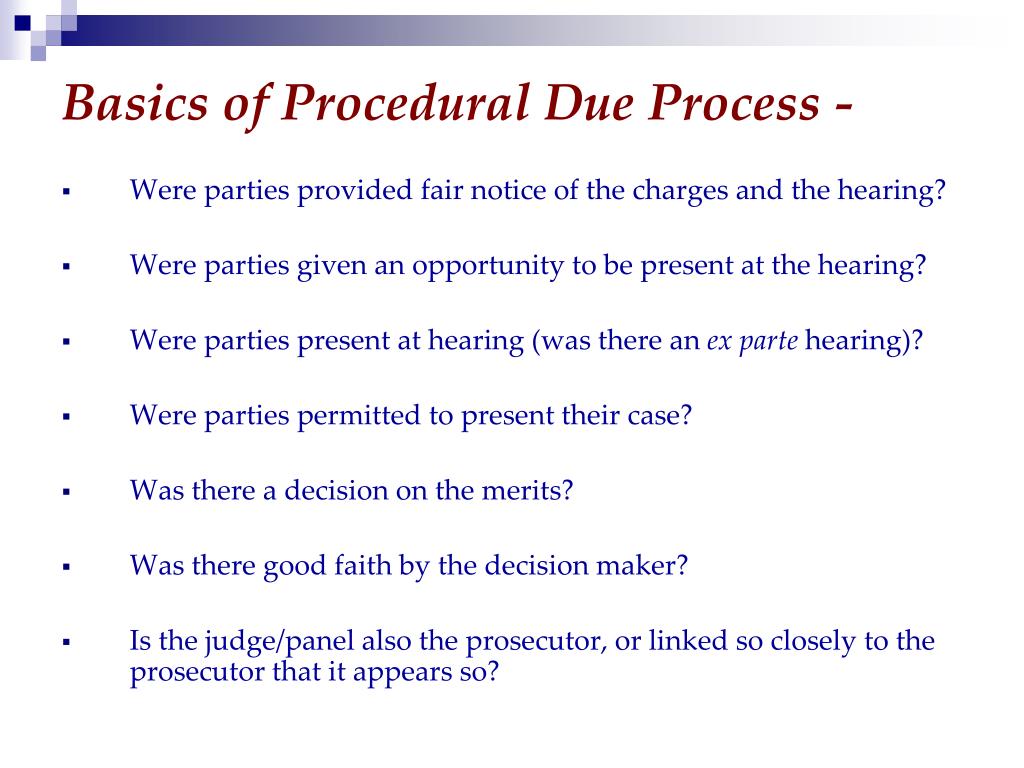 Basics of Procedural Due Process - • Were parties provided fair notice of the charges and the hearing? • Were parties given an opportunity to be present at the hearing? • Were parties present at hearing (was there an ex parte hearing)? • Were parties permitted to present their case? • Was there a decision on the merits? • Was there good faith by the decision maker? • Is the judge/panel also the prosecutor, or linked so closely to the prosecutor that it appears so?