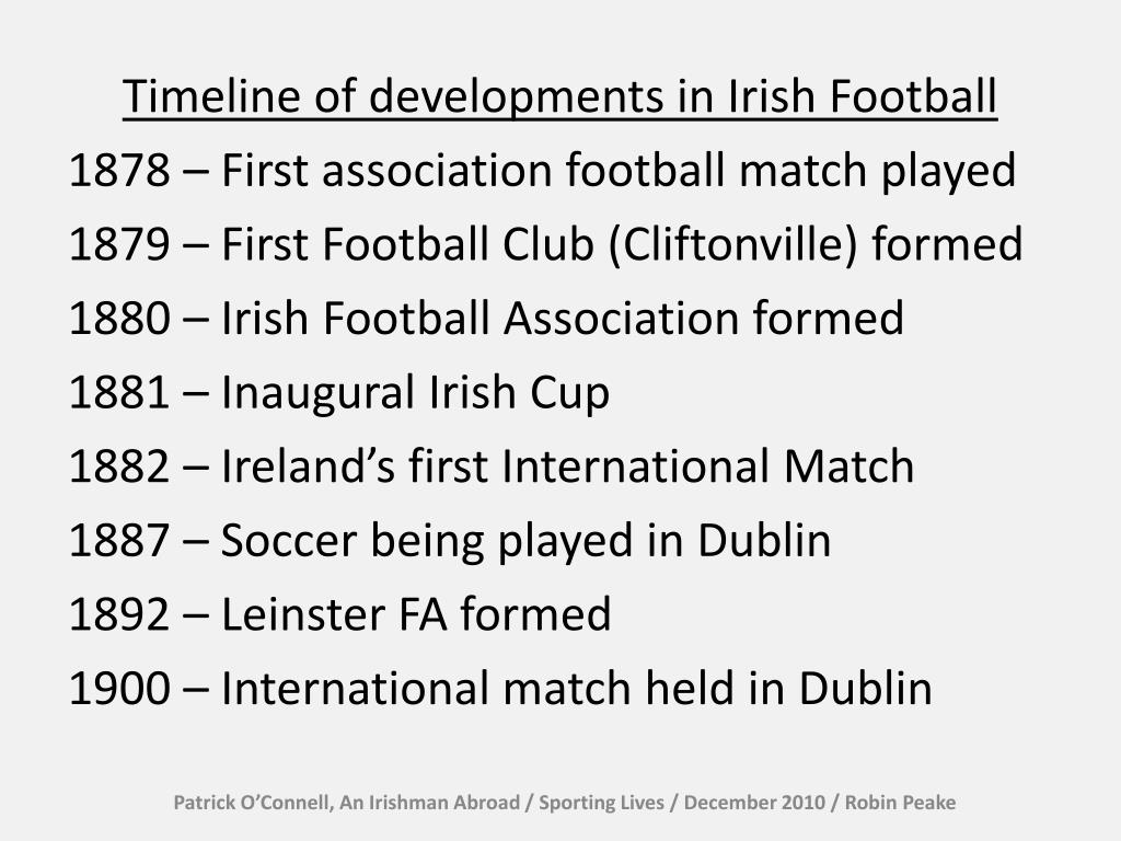 Patrick O’Connell, An Irishman Abroad / Sporting Lives / December 2010 / Robin Peake Timeline of developments in Irish Football 1878 – First association football match played 1879 – First Football Club (Cliftonville) formed 1880 – Irish Football Association formed 1881 – Inaugural Irish Cup 1882 – Ireland’s first International Match 1887 – Soccer being played in Dublin 1892 – Leinster FA formed 1900 – International match held in Dublin