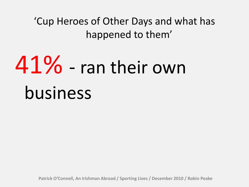 Patrick O’Connell, An Irishman Abroad / Sporting Lives / December 2010 / Robin Peake ‘Cup Heroes of Other Days and what has happened to them’ 41% - ran their own business 30% - involved in coaching