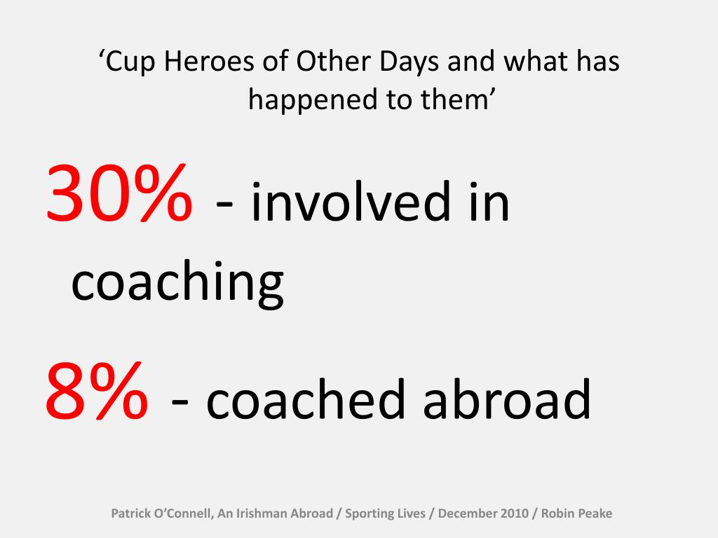 Patrick O’Connell, An Irishman Abroad / Sporting Lives / December 2010 / Robin Peake ‘Cup Heroes of Other Days and what has happened to them’ 30% - involved in coaching 8% - coached abroad