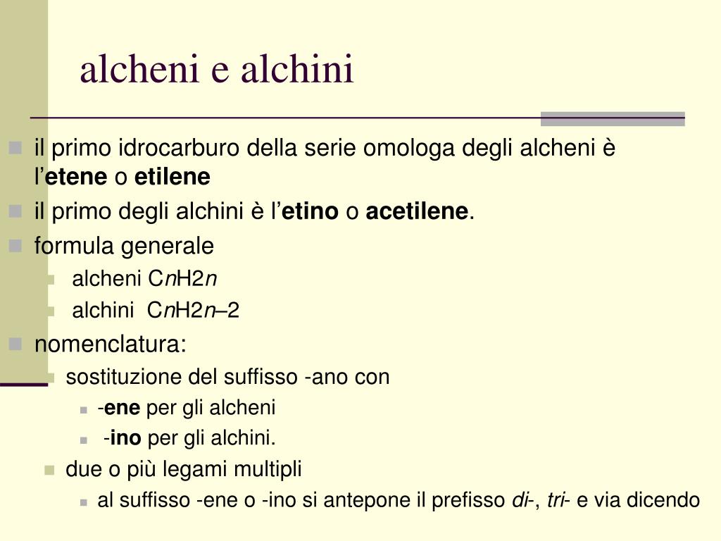 alcheni e alchini • il primo idrocarburo della serie omologa degli alcheni è l’etene o etilene • il primo degli alchini è l’etino o acetilene. • formula generale • alcheni CnH2n • alchini CnH2n–2 • nomenclatura: • sostituzione del suffisso -ano con • -ene per gli alcheni • -ino per gli alchini. • due o più legami multipli • al suffisso -ene o -ino si antepone il prefisso di-, tri- e via dicendo