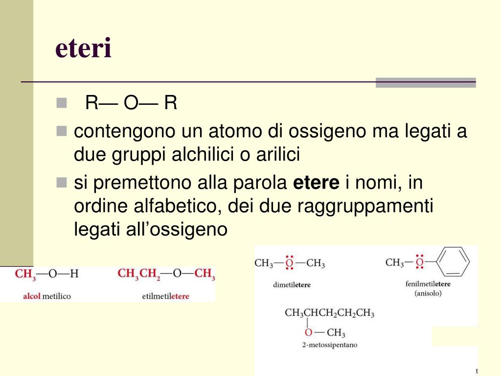 eteri • R— O— R • contengono un atomo di ossigeno ma legati a due gruppi alchilici o arilici • si premettono alla parola etere i nomi, in ordine alfabetico, dei due raggruppamenti legati all’ossigeno nnnnnn
