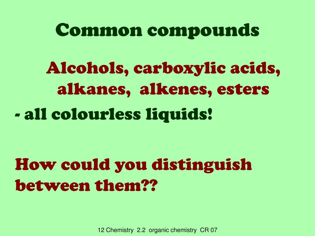 Common compounds • Alcohols, carboxylic acids, alkanes, alkenes, esters • - all colourless liquids! • How could you distinguish between them?? 12 Chemistry 2.2 organic chemistry CR 07