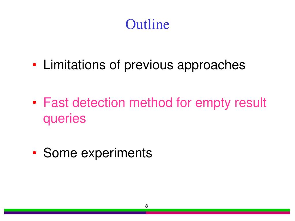 Outline • Limitations of previous approaches • Fast detection method for empty result queries • Some experiments