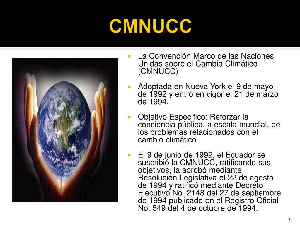 CMNUCC • La Convención Marco de las Naciones Unidas sobre el Cambio Climático (CMNUCC) • Adoptada en Nueva York el 9 de mayo de 1992 y entró en vigor el 21 de marzo de 1994. • Objetivo Especifico: Reforzar la conciencia pública, a escala mundial, de los problemas relacionados con el cambio climático • El 9 de junio de 1992, el Ecuador se suscribió la CMNUCC, ratificando sus objetivos, la aprobó mediante Resolución Legislativa el 22 de agosto de 1994 y ratificó mediante Decreto Ejecutivo No. 2148 del 27 de septiembre de 1994 publicado en el Registro Oficial No. 549 del 4 de octubre de 1994.