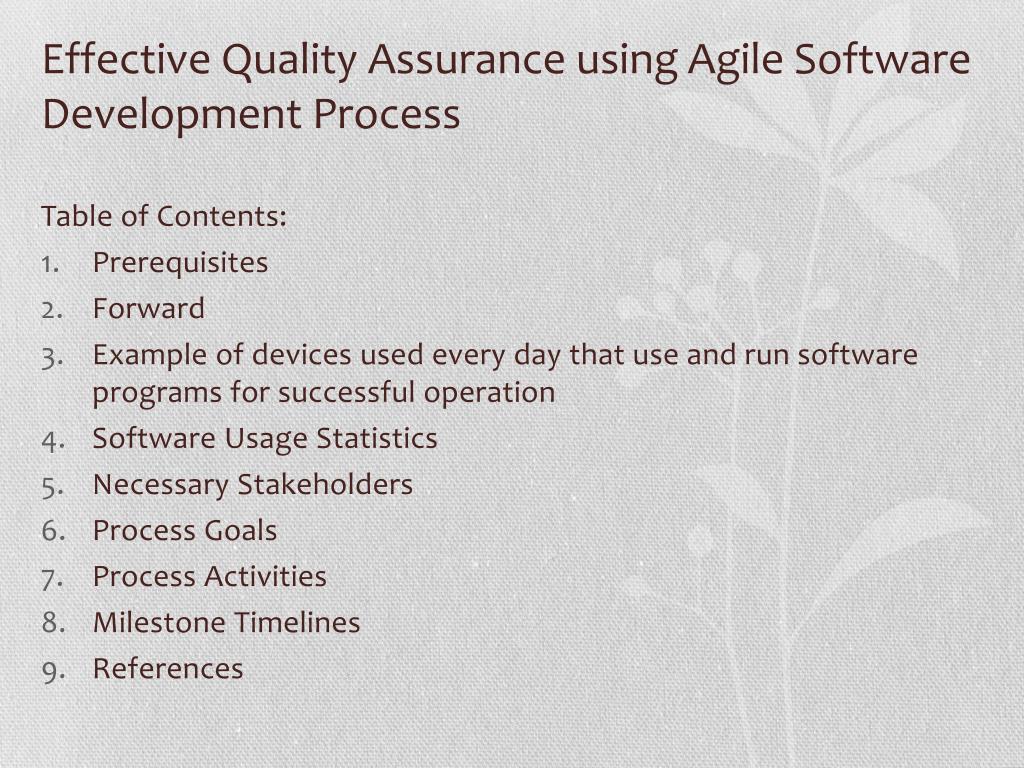 Effective Quality Assurance using Agile Software Development Process Table of Contents: • Prerequisites • Forward • Example of devices used every day that use and run software programs for successful operation • Software Usage Statistics • Necessary Stakeholders • Process Goals • Process Activities • Milestone Timelines • References