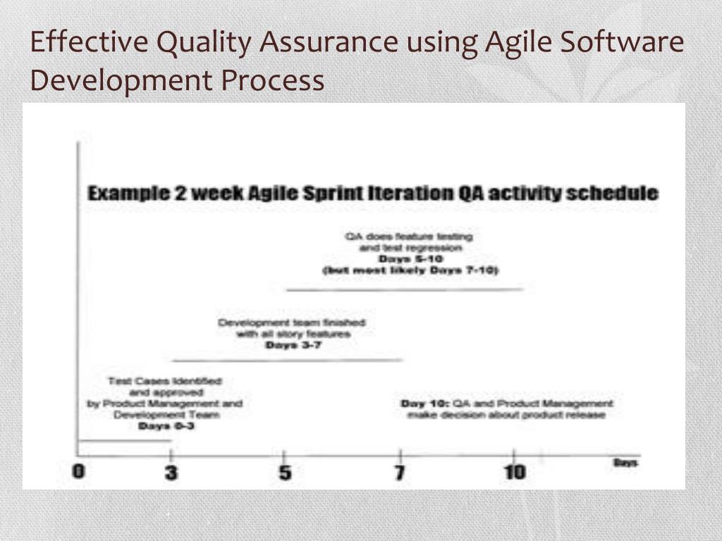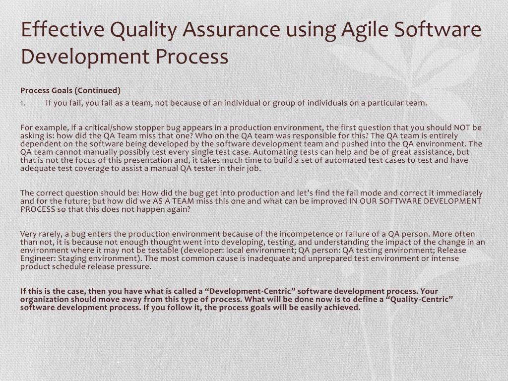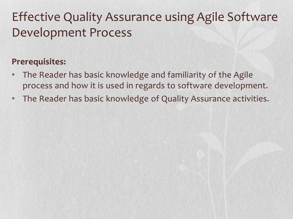 Effective Quality Assurance using Agile Software Development Process Prerequisites: • The Reader has basic knowledge and familiarity of the Agile process and how it is used in regards to software development. • The Reader has basic knowledge of Quality Assurance activities.