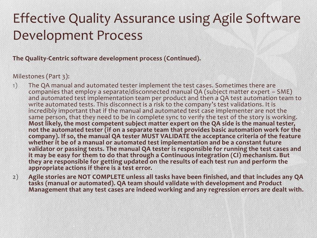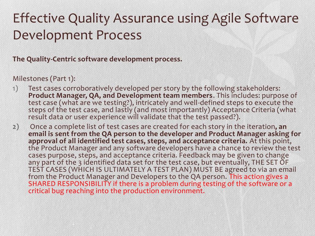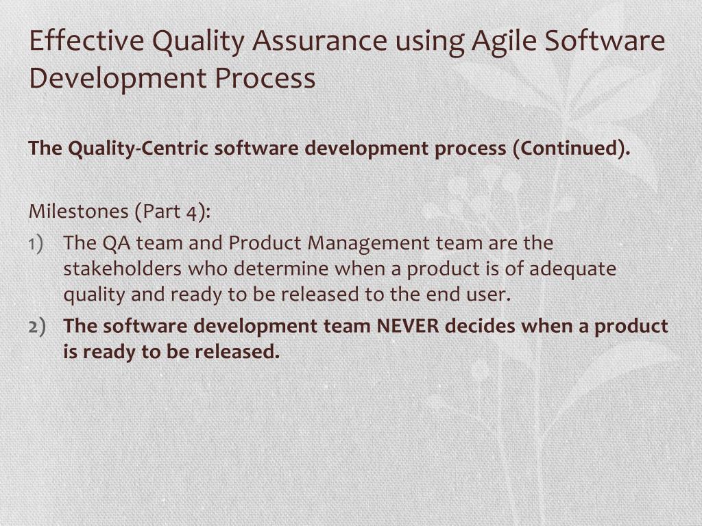Effective Quality Assurance using Agile Software Development Process The Quality-Centric software development process (Continued). Milestones (Part 4): • The QA team and Product Management team are the stakeholders who determine when a product is of adequate quality and ready to be released to the end user. • The software development team NEVER decides when a product is ready to be released.