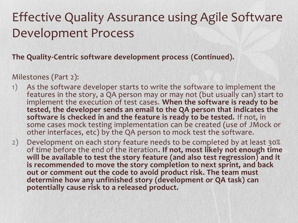 Effective Quality Assurance using Agile Software Development Process The Quality-Centric software development process (Continued). Milestones (Part 2): • As the software developer starts to write the software to implement the features in the story, a QA person may or may not (but usually can) start to implement the execution of test cases. When the software is ready to be tested, the developer sends an email to the QA person that indicates the software is checked in and the feature is ready to be tested. If not, in some cases mock testing implementation can be created (use of JMock or other interfaces, etc) by the QA person to mock test the software. • Development on each story feature needs to be completed by at least 30% of time before the end of the iteration. If not, most likely not enough time will be available to test the story feature (and also test regression) and it is recommended to move the story completion to next sprint, and back out or comment out the code to avoid product risk. The team must determine how any unfinished story (development or QA task) can potentially cause risk to a released product.