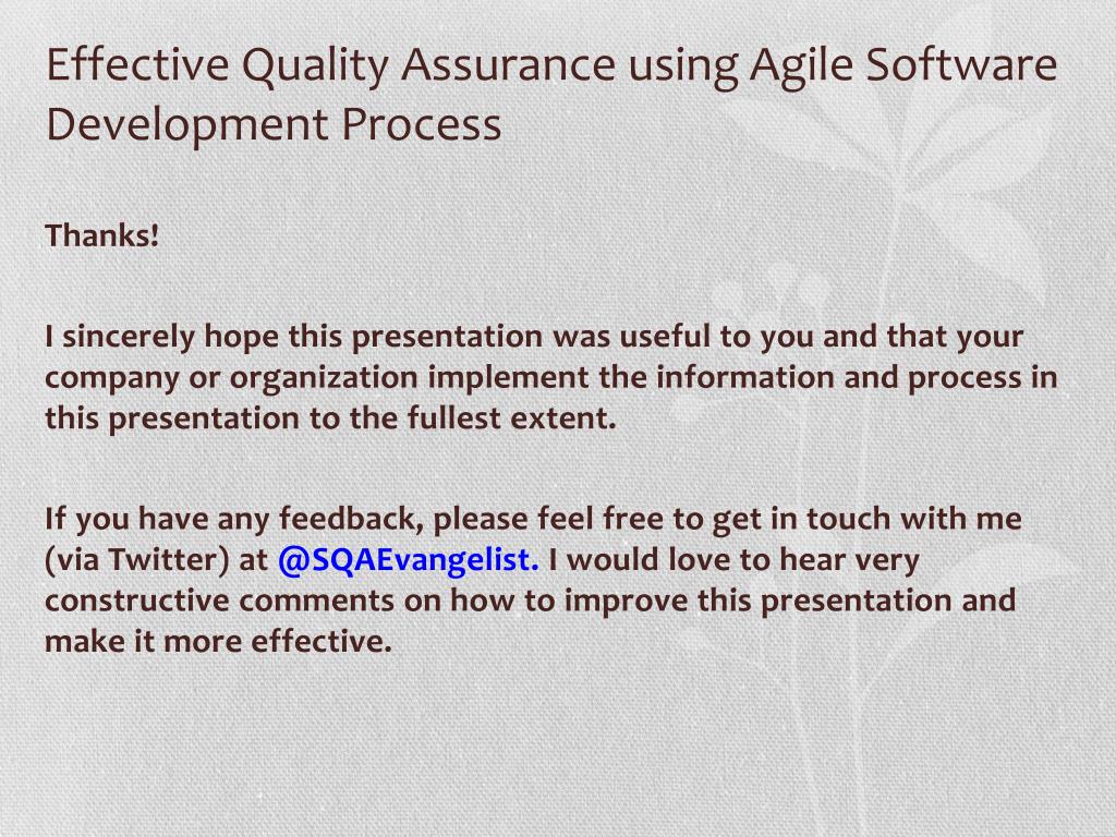Effective Quality Assurance using Agile Software Development Process Thanks! I sincerely hope this presentation was useful to you and that your company or organization implement the information and process in this presentation to the fullest extent. If you have any feedback, please feel free to get in touch with me (via Twitter) at @SQAEvangelist. I would love to hear very constructive comments on how to improve this presentation and make it more effective.