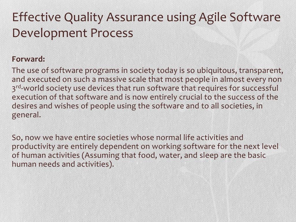 Effective Quality Assurance using Agile Software Development Process Forward: The use of software programs in society today is so ubiquitous, transparent, and executed on such a massive scale that most people in almost every non 3rd-world society use devices that run software that requires for successful execution of that software and is now entirely crucial to the success of the desires and wishes of people using the software and to all societies, in general. So, now we have entire societies whose normal life activities and productivity are entirely dependent on working software for the next level of human activities (Assuming that food, water, and sleep are the basic human needs and activities).