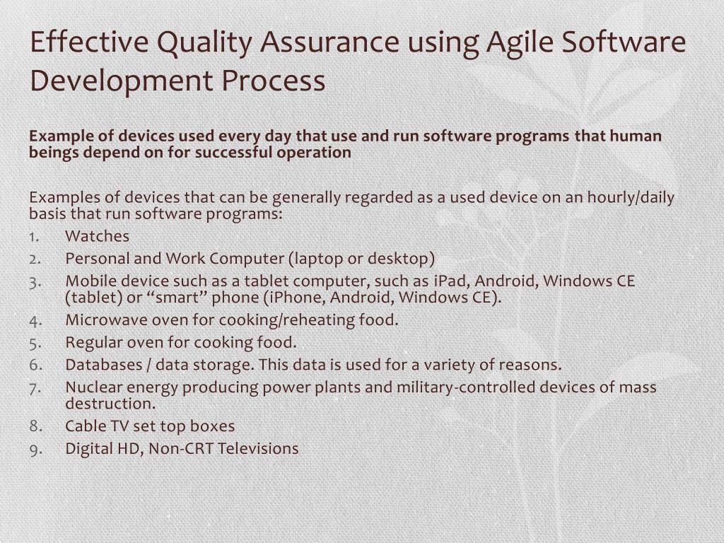 Effective Quality Assurance using Agile Software Development Process Example of devices used every day that use and run software programs that human beings depend on for successful operation Examples of devices that can be generally regarded as a used device on an hourly/daily basis that run software programs: • Watches • Personal and Work Computer (laptop or desktop) • Mobile device such as a tablet computer, such as iPad, Android, Windows CE (tablet) or “smart” phone (iPhone, Android, Windows CE). • Microwave oven for cooking/reheating food. • Regular oven for cooking food. • Databases / data storage. This data is used for a variety of reasons. • Nuclear energy producing power plants and military-controlled devices of mass destruction. • Cable TV set top boxes • Digital HD, Non-CRT Televisions