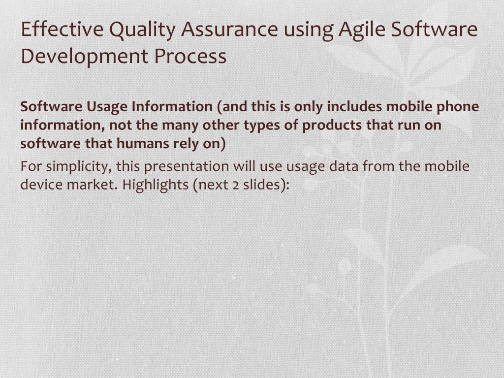 Effective Quality Assurance using Agile Software Development Process Software Usage Information (and this is only includes mobile phone information, not the many other types of products that run on software that humans rely on) For simplicity, this presentation will use usage data from the mobile device market. Highlights (next 2 slides):