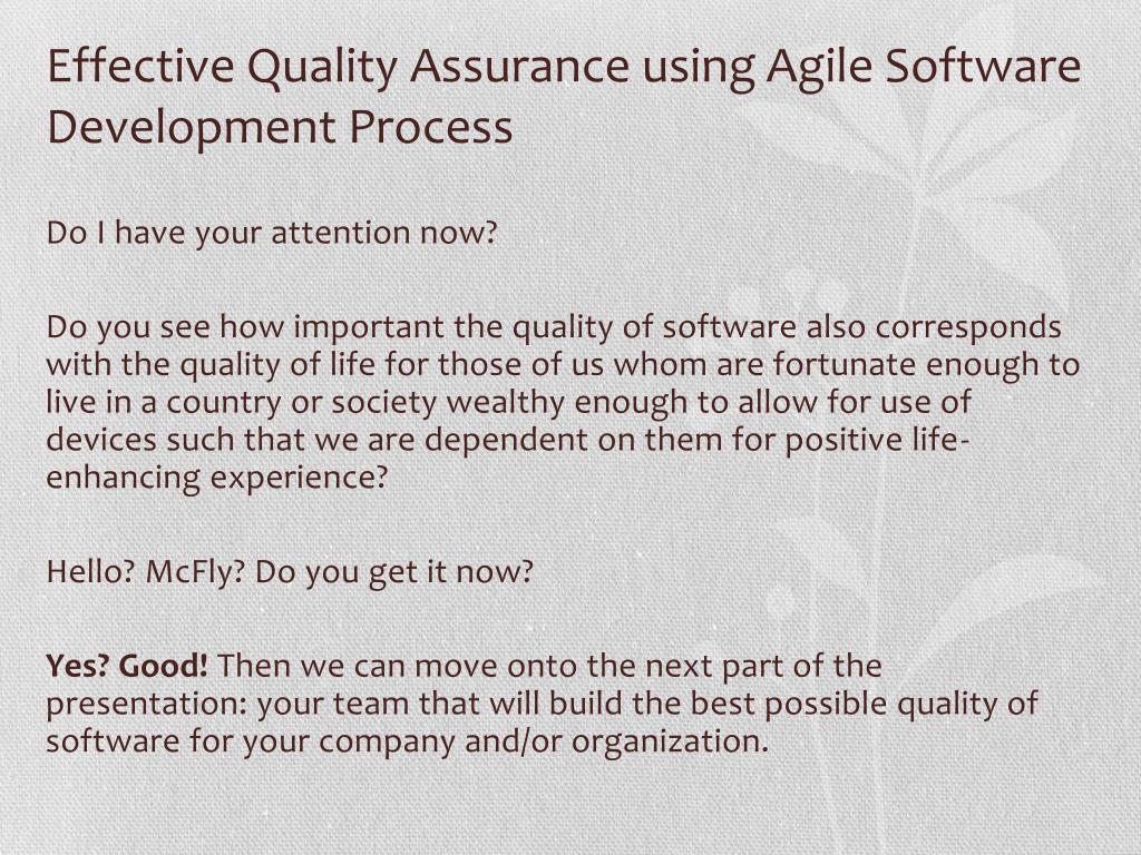 Effective Quality Assurance using Agile Software Development Process Do I have your attention now? Do you see how important the quality of software also corresponds with the quality of life for those of us whom are fortunate enough to live in a country or society wealthy enough to allow for use of devices such that we are dependent on them for positive life-enhancing experience? Hello? McFly? Do you get it now? Yes? Good! Then we can move onto the next part of the presentation: your team that will build the best possible quality of software for your company and/or organization.