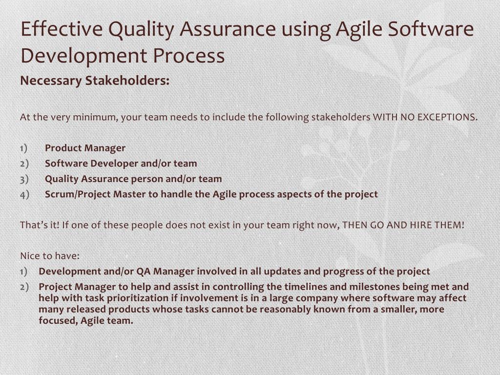Effective Quality Assurance using Agile Software Development Process Necessary Stakeholders: At the very minimum, your team needs to include the following stakeholders WITH NO EXCEPTIONS. • Product Manager • Software Developer and/or team • Quality Assurance person and/or team • Scrum/Project Master to handle the Agile process aspects of the project That’s it! If one of these people does not exist in your team right now, THEN GO AND HIRE THEM! Nice to have: • Development and/or QA Manager involved in all updates and progress of the project • Project Manager to help and assist in controlling the timelines and milestones being met and help with task prioritization if involvement is in a large company where software may affect many released products whose tasks cannot be reasonably known from a smaller, more focused, Agile team.