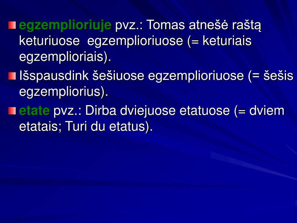 egzemplioriujepvz.: Tomas atnešė raštą keturiuose egzemplioriuose (= keturiais egzemplioriais). Išspausdink šešiuose egzemplioriuose (= šešis egzempliorius). etatepvz.: Dirba dviejuose etatuose (= dviem etatais; Turi du etatus).
