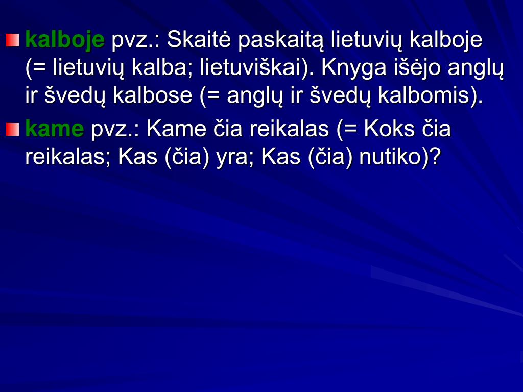 kalbojepvz.: Skaitė paskaitą lietuvių kalboje (= lietuvių kalba; lietuviškai). Knyga išėjo anglų ir švedų kalbose (= anglų ir švedų kalbomis). kamepvz.: Kame čia reikalas (= Koks čia reikalas; Kas (čia) yra; Kas (čia) nutiko)?