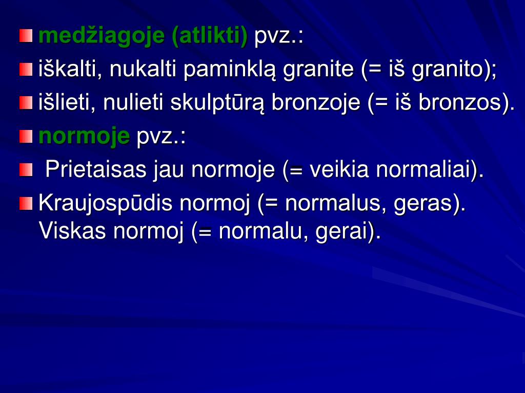 medžiagoje (atlikti)pvz.: iškalti, nukalti paminklą granite (= iš granito); išlieti, nulieti skulptūrą bronzoje (= iš bronzos). normojepvz.: Prietaisas jau normoje (= veikia normaliai). Kraujospūdis normoj (= normalus, geras). Viskas normoj (= normalu, gerai).