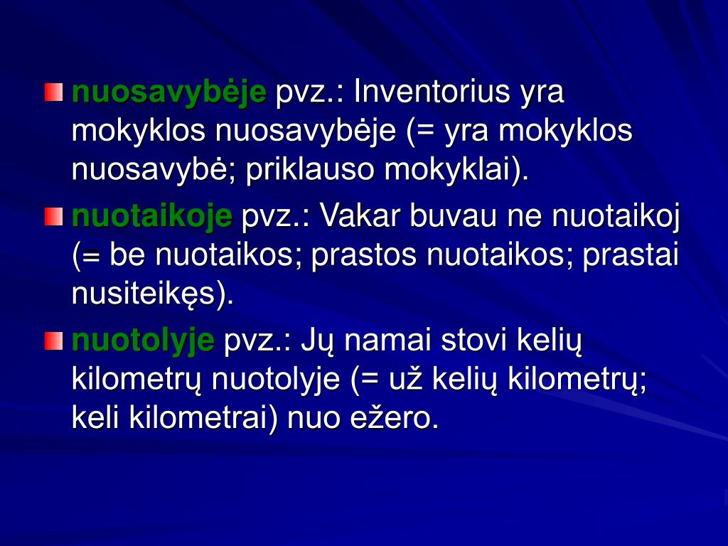 nuosavybėje pvz.: Inventorius yra mokyklos nuosavybėje (= yra mokyklos nuosavybė; priklauso mokyklai). nuotaikoje pvz.: Vakar buvau ne nuotaikoj (= be nuotaikos; prastos nuotaikos; prastai nusiteikęs). nuotolyjepvz.: Jų namai stovi kelių kilometrų nuotolyje (= už kelių kilometrų; keli kilometrai) nuo ežero.