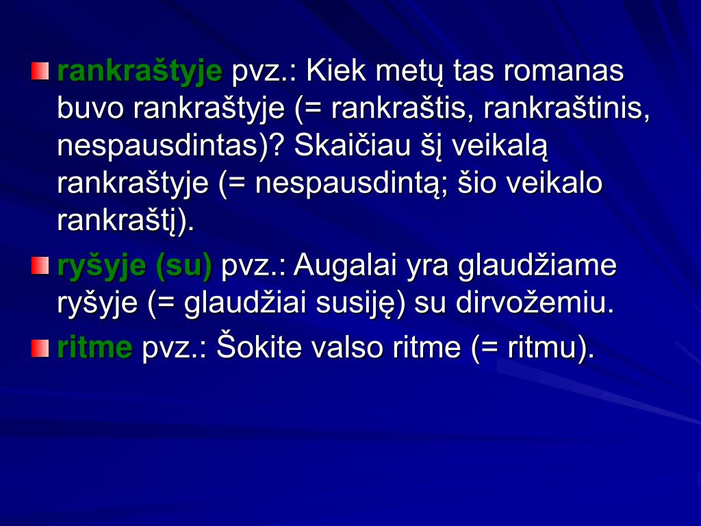 rankraštyjepvz.: Kiek metų tas romanas buvo rankraštyje (= rankraštis, rankraštinis, nespausdintas)? Skaičiau šį veikalą rankraštyje (= nespausdintą; šio veikalo rankraštį). ryšyje (su)pvz.: Augalai yra glaudžiame ryšyje (= glaudžiai susiję) su dirvožemiu. ritmepvz.: Šokite valso ritme (= ritmu).