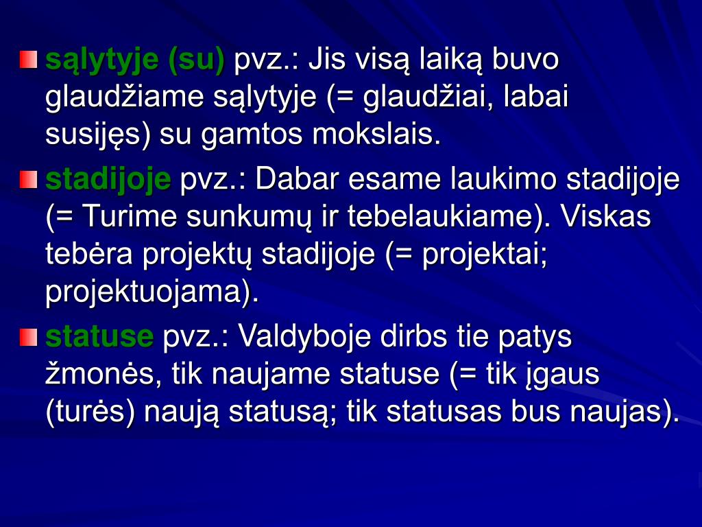 sąlytyje (su)pvz.: Jis visą laiką buvo glaudžiame sąlytyje (= glaudžiai, labai susijęs) su gamtos mokslais. stadijojepvz.: Dabar esame laukimo stadijoje (= Turime sunkumų ir tebelaukiame). Viskas tebėra projektų stadijoje (= projektai; projektuojama). statusepvz.: Valdyboje dirbs tie patys žmonės, tik naujame statuse (= tik įgaus (turės) naują statusą; tik statusas bus naujas).