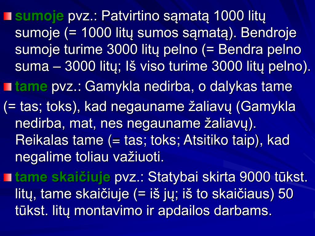 sumojepvz.: Patvirtino sąmatą 1000 litų sumoje (= 1000 litų sumos sąmatą). Bendroje sumoje turime 3000 litų pelno (= Bendra pelno suma – 3000 litų; Iš viso turime 3000 litų pelno). tamepvz.: Gamykla nedirba, o dalykas tame (= tas; toks), kad negauname žaliavų (Gamykla nedirba, mat, nes negauname žaliavų). Reikalas tame (= tas; toks; Atsitiko taip), kad negalime toliau važiuoti. tame skaičiujepvz.: Statybai skirta 9000 tūkst. litų, tame skaičiuje (= iš jų; iš to skaičiaus) 50 tūkst. litų montavimo ir apdailos darbams.