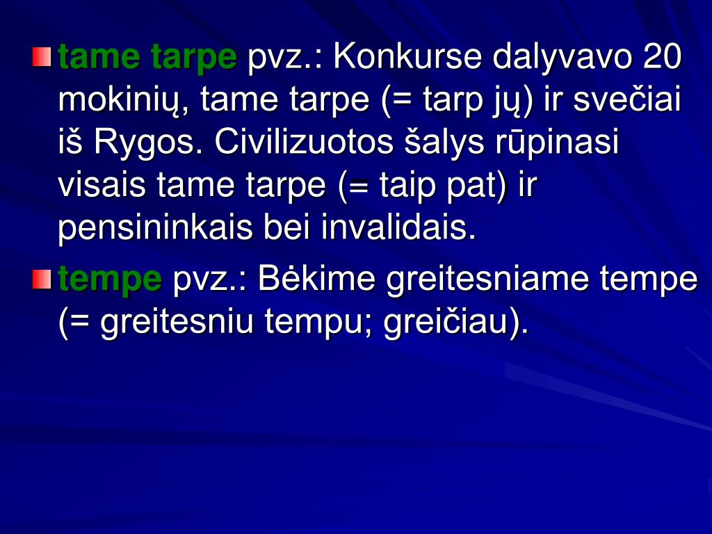 tame tarpepvz.: Konkurse dalyvavo 20 mokinių, tame tarpe (= tarp jų) ir svečiai iš Rygos. Civilizuotos šalys rūpinasi visais tame tarpe (= taip pat) ir pensininkais bei invalidais. tempepvz.: Bėkime greitesniame tempe (= greitesniu tempu; greičiau).