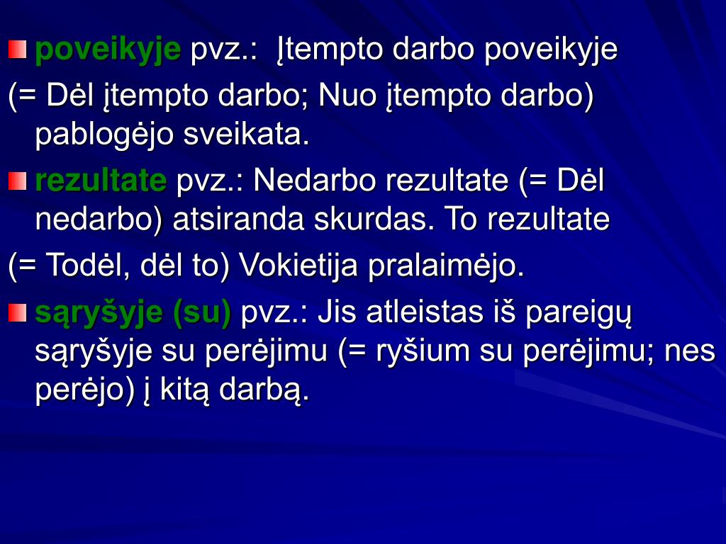 poveikyjepvz.: Įtempto darbo poveikyje (= Dėl įtempto darbo; Nuo įtempto darbo) pablogėjo sveikata. rezultatepvz.: Nedarbo rezultate (= Dėl nedarbo) atsiranda skurdas. To rezultate (= Todėl, dėl to) Vokietija pralaimėjo. sąryšyje (su)pvz.: Jis atleistas iš pareigų sąryšyje su perėjimu (= ryšium su perėjimu; nes perėjo) į kitą darbą.