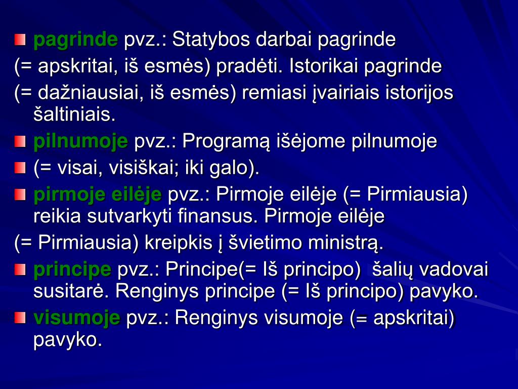 pagrinde pvz.: Statybos darbai pagrinde (= apskritai, iš esmės) pradėti. Istorikai pagrinde (= dažniausiai, iš esmės) remiasi įvairiais istorijos šaltiniais. pilnumojepvz.: Programą išėjome pilnumoje (= visai, visiškai; iki galo). pirmoje eilėjepvz.: Pirmoje eilėje (= Pirmiausia) reikia sutvarkyti finansus. Pirmoje eilėje (= Pirmiausia) kreipkis į švietimo ministrą. principepvz.: Principe(= Iš principo) šalių vadovai susitarė. Renginys principe (= Iš principo) pavyko. visumojepvz.: Renginys visumoje (= apskritai) pavyko.