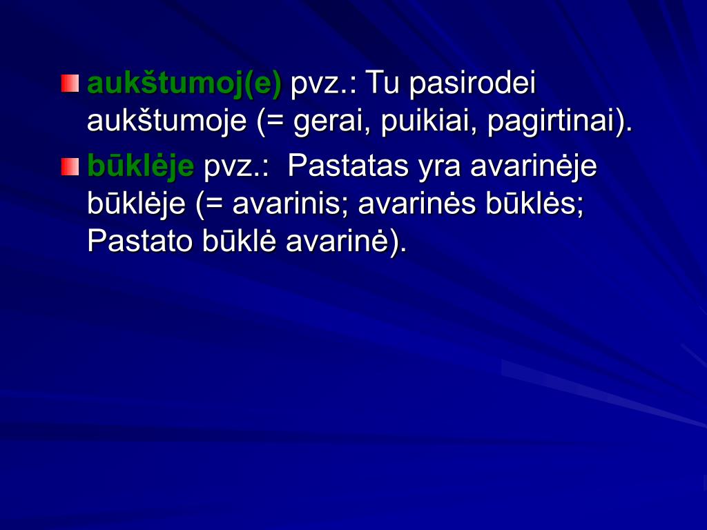 aukštumoj(e)pvz.: Tu pasirodei aukštumoje (= gerai, puikiai, pagirtinai). būklėjepvz.: Pastatas yra avarinėje būklėje (= avarinis; avarinės būklės; Pastato būklė avarinė).