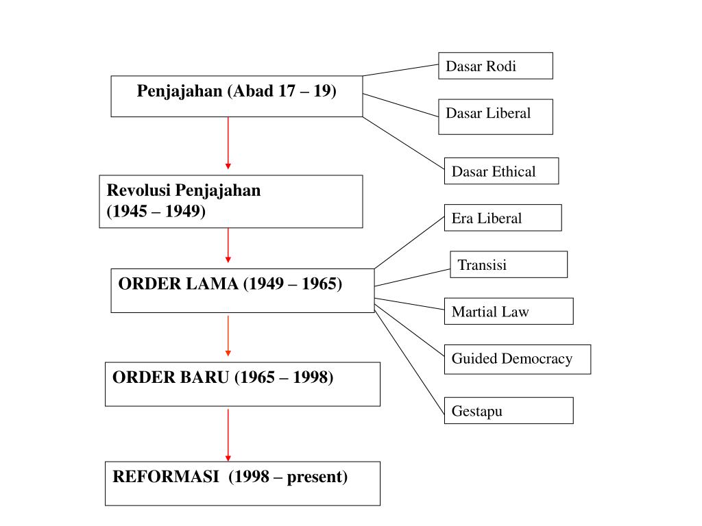 Dasar Rodi. Penjajahan (Abad 17 – 19). Dasar Liberal. Dasar Ethical. Revolusi Penjajahan (1945 – 1949). Era Liberal. Transisi. ORDER LAMA (1949 – 1965). Martial Law. Guided Democracy. ORDER BARU (1965 – 1998). Gestapu. REFORMASI (1998 – present). ORDER BARU (1965-1998).