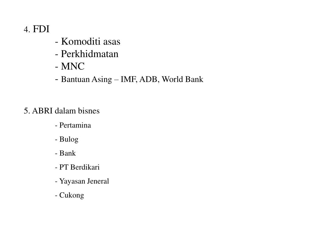 4. FDI • - Komoditi asas • - Perkhidmatan • - MNC • - Bantuan Asing – IMF, ADB, World Bank • 5. ABRI dalam bisnes • Pertamina • Bulog • Bank • PT Berdikari • Yayasan Jeneral • Cukong