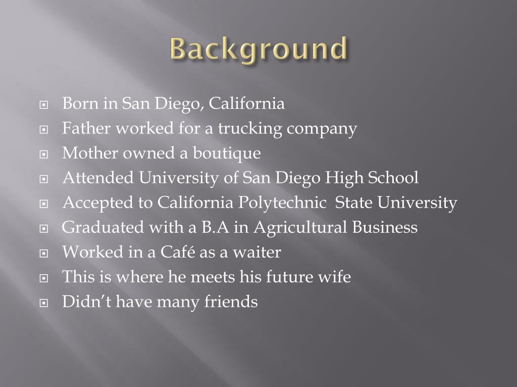Background • Born in San Diego, California • Father worked for a trucking company • Mother owned a boutique • Attended University of San Diego High School • Accepted to California Polytechnic State University • Graduated with a B.A in Agricultural Business • Worked in a Café as a waiter • This is where he meets his future wife • Didn’t have many friends