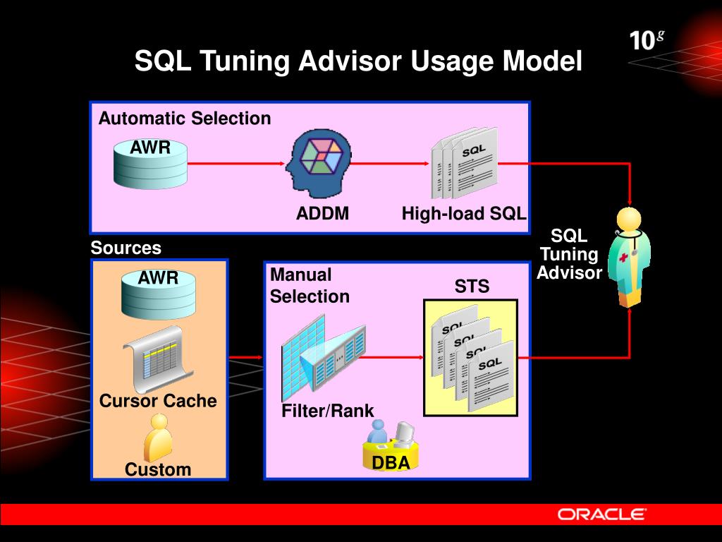 SQL Tuning Advisor Usage Model Automatic Selection AWR ADDM High-load SQL SQLTuning Advisor Sources ManualSelection AWR STS Cursor Cache Filter/Rank DBA Custom
