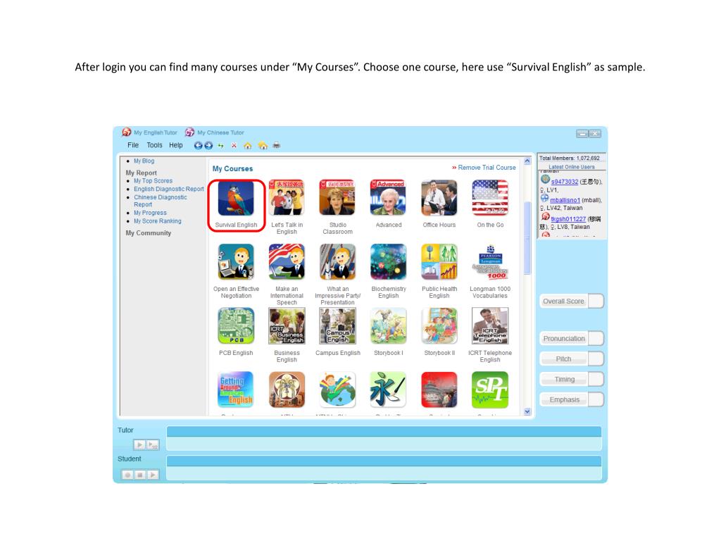 After login you can find many courses under “My Courses”. Choose one course, here use “Survival English” as sample.