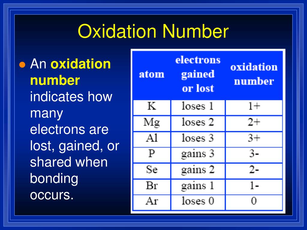 Oxidation Number • An oxidation number indicates how many electrons are lost, gained, or shared when bonding occurs.