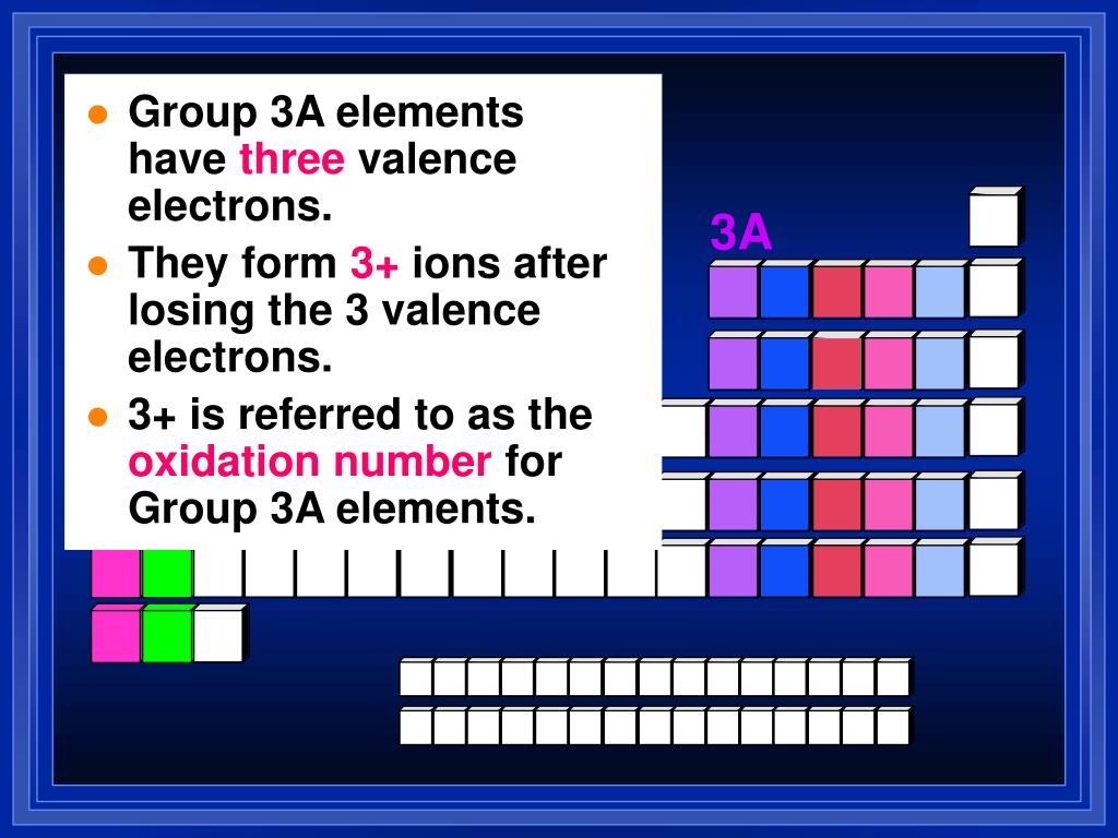 Group 3A elements havethree valence electrons. • They form3+ions after losing the 3 valence electrons. • 3+ is referred to as theoxidation numberfor Group 3A elements. 3A