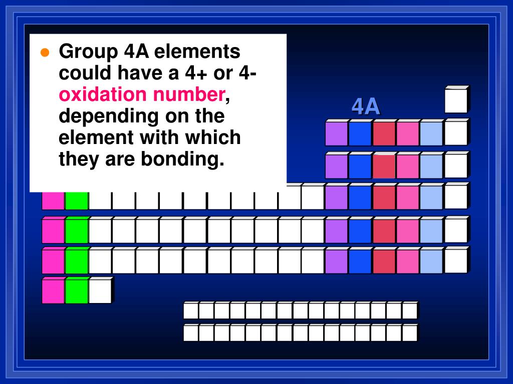 Group 4A elements could have a 4+ or 4-oxidation number, depending on the element with which they are bonding. 4A