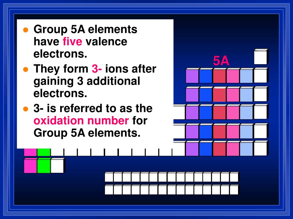 Group 5A elements havefive valence electrons. • They form3-ions after gaining 3 additional electrons. • 3- is referred to as theoxidation numberfor Group 5A elements. 5A