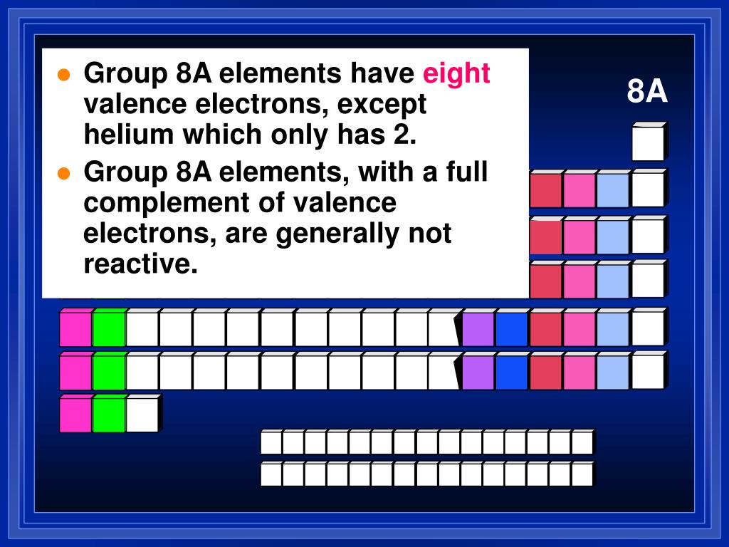 Group 8A elements haveeight valence electrons, except helium which only has 2. • Group 8A elements, with a full complement of valence electrons, are generally not reactive. 8A
