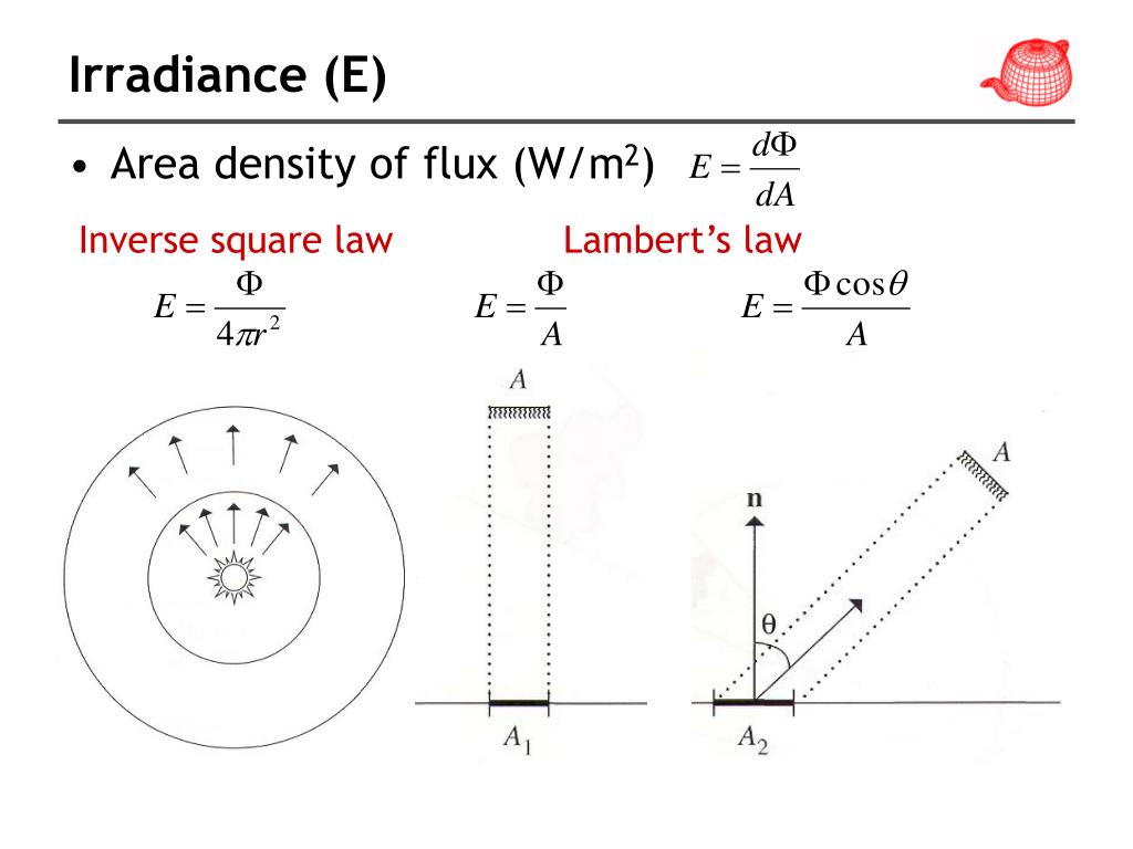 Irradiance (E) • Area density of flux (W/m2) Inverse square law Lambert’s law