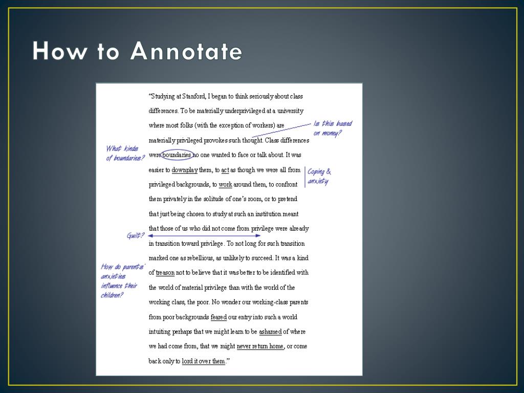 One Specific Way to Annotate • First read the passage and reflect on the content. • Then, grab a pen. • Circle concepts or key terms • Underline main ideas. • Enumerate (1, 2, 3, etc) major supporting details. • Use alphabet (a, b, c) for minor supporting details. • Make abbreviated outline on margins or new sheet of paper.