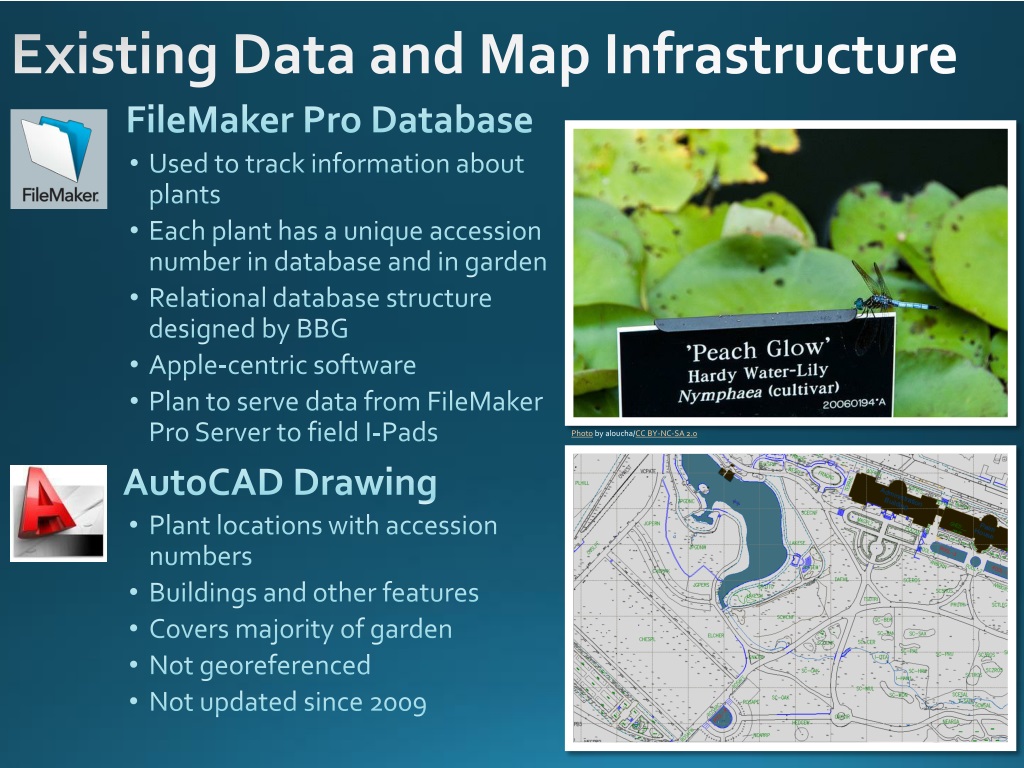 Existing Data and Map Infrastructure FileMaker Pro Database • Used to track information about plants • Each plant has a unique accession number in database and in garden • Relational database structure designed by BBG • Apple-centric software • Plan to serve data from FileMaker Pro Server to field I-Pads Photo by aloucha/CC BY-NC-SA 2.0 AutoCAD Drawing • Plant locations with accession numbers • Buildings and other features • Covers majority of garden • Not georeferenced • Not updated since 2009