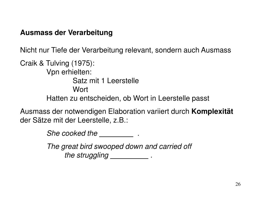 Ausmass der Verarbeitung Nicht nur Tiefe der Verarbeitung relevant, sondern auch Ausmass Craik & Tulving (1975): Vpn erhielten: Satz mit 1 Leerstelle Wort Hatten zu entscheiden, ob Wort in Leerstelle passt Ausmass der notwendigen Elaboration variiert durch Komplexität der Sätze mit der Leerstelle, z.B.: She cooked the . The great bird swooped down and carried off the struggling .